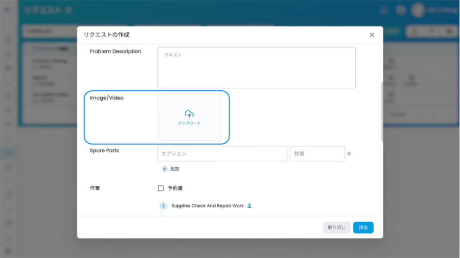 ※一部のリクエストタイプでは、まだ「画像/動画」欄が表示されない場合があります。その場合、管理者が「テンプレート」設定の「情報欄」に「画像/動画」欄を追加することで、簡単に有効化できます。