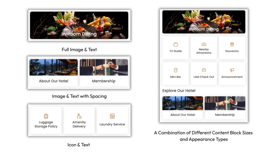 Three Display Styles: Match your brand's aesthetic by selecting from full image with text, image and text with spacing, or a clean icon and text style.