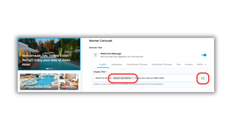 The updated Banner Carousel now supports dynamic variables, allowing you to automatically personalize welcome messages for every guest.