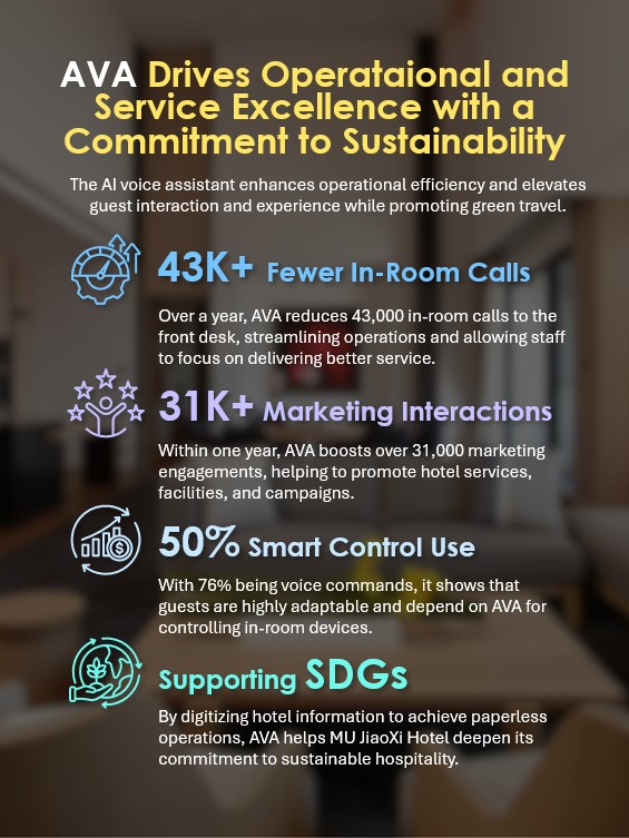 Beyond convenience, AVA has become both a powerful marketing tool and a driver of sustainability. Within a year, it generated over 30,000 marketing interactions by proactively promoting hotel services and facilities, enabling guests to discover spa treatments, dining options, and local attractions through natural conversation with their in‑room assistant. At the same time, by replacing traditional paper‑based compendiums, AVA offers an interactive, eco‑friendly way for guests to access hotel information—enhancing engagement while supporting a greener future.